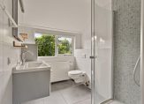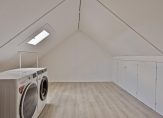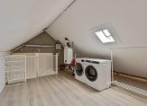 Op de eerste verdieping kom je via de overloop bij drie slaapkamers, waarvan twee royaal bemeten. De gehele verdieping is voorzien van een laminaatvloer, wat zorgt voor een moderne uitstraling. De badkamer is licht en eigentijds, voorzien van een douchecabine, een fraai wastafelmeubel en een zwevend toilet. Via een vaste trap kom je op de ruime zolderverdieping, die nog volledig open is en naar eigen wens kan worden ingedeeld. Hier bevinden zich ook de aansluitingen voor de wasmachine en droger, evenals de CV-ketel.