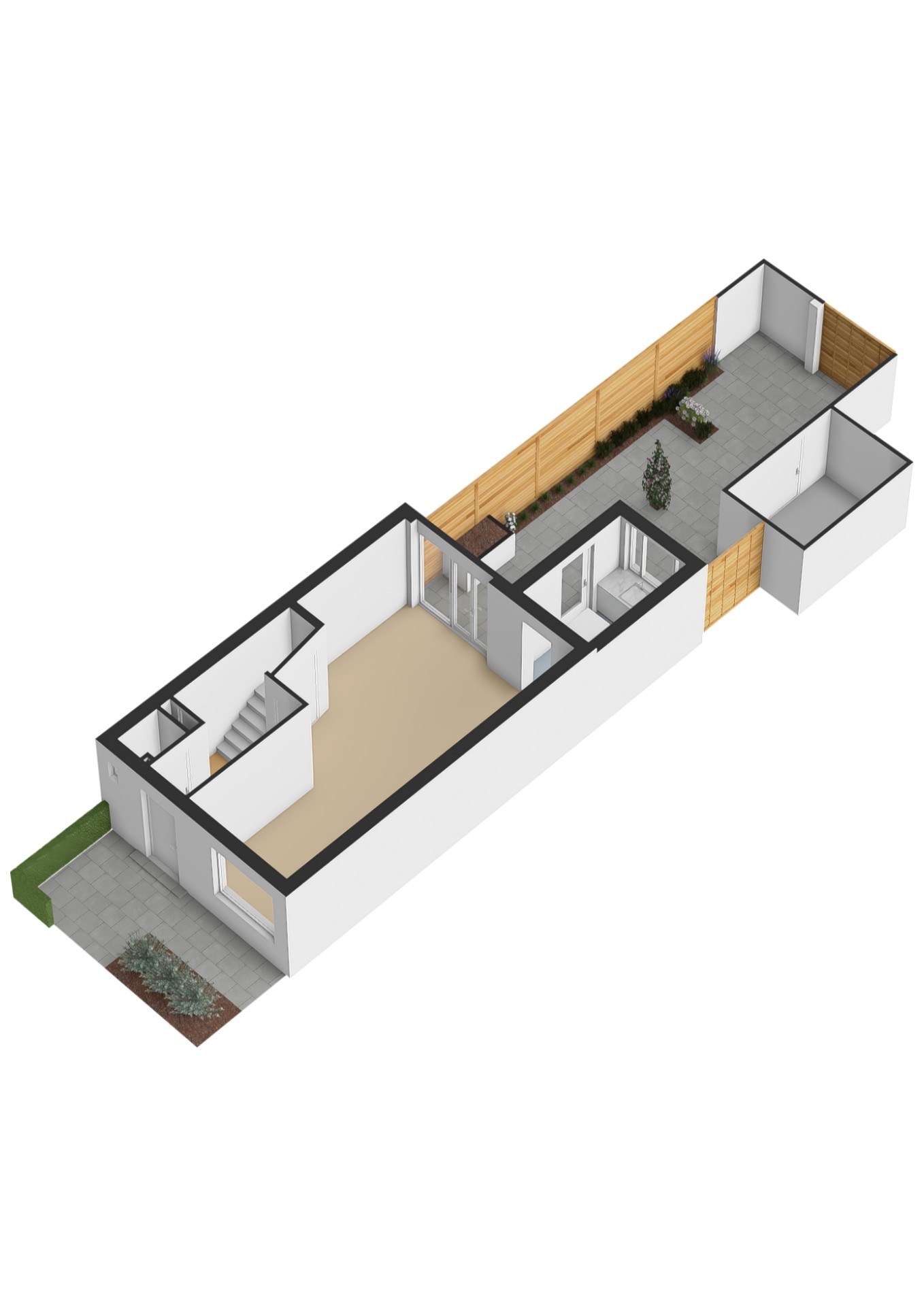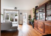 Stap binnen via de voortuin en je wordt verwelkomd in de hal met trapopgang, meterkast en toiletruimte. Via de voortuin stap je binnen in de hal met trapopgang, meterkast en toilet. De woonkamer voelt licht en sfeervol, met een houten vloer en openslaande deuren naar de tuin, ideaal voor lange zomeravonden. De halfopen keuken is modern en compleet met inductiekookplaat, vaatwasser, koelkast en oven.