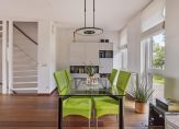 We nemen de trap naar de eerste verdieping. Zeer lichte en ruime woonkamer, door de raampartijen aan weerszijden en de fantastische zon ligging op het zuiden, is daglicht in de woonkamer dus gewaarborgd. De woonkamer is evenals de rest van de woning netjes afgewerkt en heeft een houten vloer. Vanuit de woonkamer heb je door middel van de schuifpui toegang tot het tweede terras, welke even als het terras beneden gesitueerd is op het zuiden.