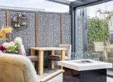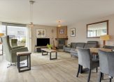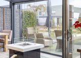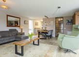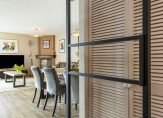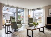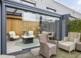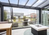 ^ Ruime woonkamer met schuifpui naar tuinkamer