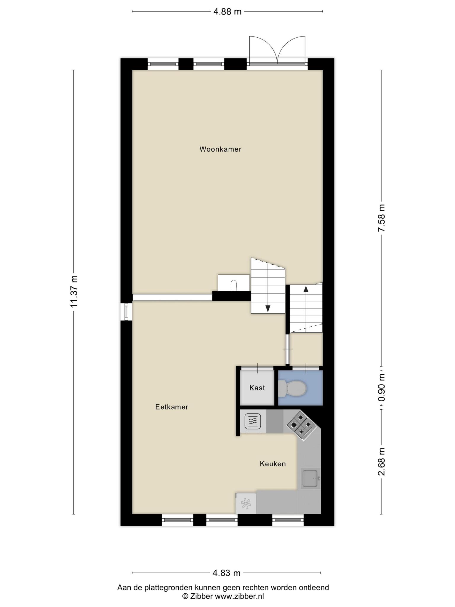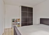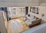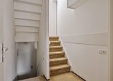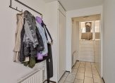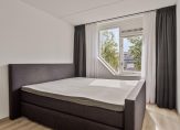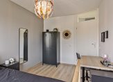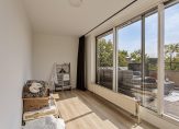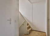 Deze woning biedt een ruime en lichte woonkamer op de tweede verdieping, bereikbaar via een trap vanuit de ontvangsthal op de eerste verdieping. De woonkamer heeft openslaande deuren naar een Frans balkon, wat voor extra licht en een ruimtelijk gevoel zorgt. Op de derde verdieping bevindt zich de woonkeuken, die voldoende ruimte biedt voor een eettafel. De keuken is volledig uitgerust met een gaskookplaat, een 1,5 wasbak, koelkast, oven en vaatwasser. Op ditzelfde niveau zijn ook een toiletruimte en een bergkast te vinden.