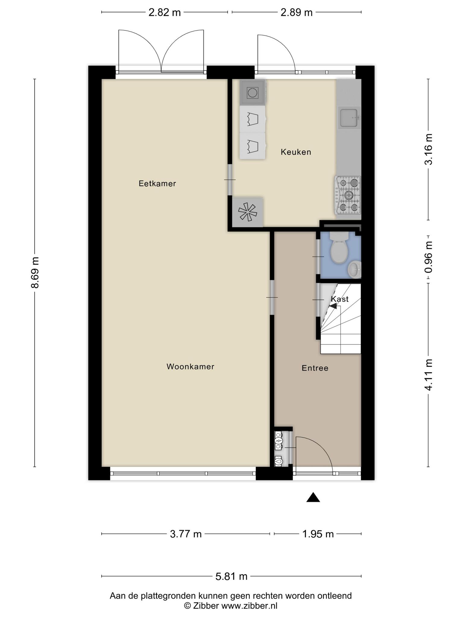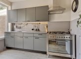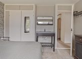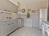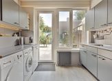 Via de gang, toilet, naar de woonkamer, met openslaande deuren van kunststof uitzicht op de grote tuin. Vanuit de woon-/eetkamer toegang naar de dichte keuken, voorzien van een gasfornuis, afzuigkap oven en vaatwasser. In de keuken is ook een wasmachine/droger-aansuiting.
