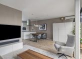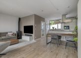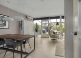 Je komt binnen in een ruime hal met een toilet, meterkast en trap naar boven. Vanuit hier stap je de gezellige woonkamer binnen, waar het daglicht je tegemoet komt dankzij de brede ramen. De strakke vloer maakt het helemaal af. Aan de voorzijde vind je de open keuken – een echte eyecatcher! Modern, stijlvol en van alle gemakken voorzien. Dankzij de slimme indeling kun je hier koken én kletsen tegelijk.