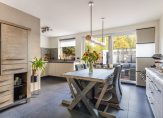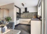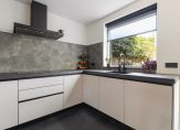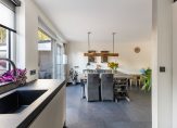 De begane grond is een plek van comfort, met zijn royale zitgedeelte van 32 m². De woonkamer heeft veel lichtinval dankzij de brede schuifpui naar de tuin. De donkere plavuizen vloer met vloerverwarming zorgt voor comfort én een strakke uitstraling. De open keuken is geplaatst in 2024 en heeft alles wat je hartje begeert qua apparatuur en afwerking. De keuken is volledig voorzien van Miele inbouwapparatuur; inductiekookplaat, extra grote koelkast, vaatwasser, afzuigkap, combi/oven combinatie en een stoomoven. Ook bevat de keuken een Quooker,