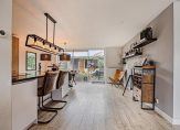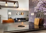 Entree, ontvangsthal met meterkast , toiletruimte en een berging. Onder de trap is plek om jassen te hangen, maar je zou ook de ruimte dicht kunnen maken voor meer berging. Ruime woonkamer en woonkeuken waarbij de schuifpui in de achtergevel voor veel lichtinval zorgt. Aan de voorzijde bevindt zich de huiskamer en de achterzijde heeft een open-/woonkeuken. Een prachtige keuken, voorzien van alle gemakken zoals de geïntegreerde koffiezetter, vaatwasser, combi-oven, een inductiekookplaat met een BORA afzuig-mechanisme en een was-/spoelbak, beiden op een kookeiland.
