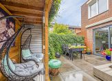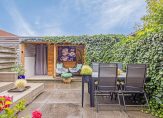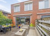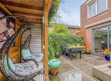 Via de schuifpui in de woonkamer komen we in de achtertuin. Deze is gelegen op het zuiden tevens voorzien van gezellige overkapping, zonwering en een achterom.