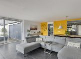 De lichte woonkamer is een heerlijke plek om samen te komen. Er is genoeg ruimte voor een grote eettafel en een royale zithoek. De grote raampartijen maken de kamer licht en ruimtelijk. Dankzij de sfeervolle gashaard en een behaaglijke vloerverwarming geniet je ook op koude dagen van een warm thuis. De woonkamer biedt prachtig uitzicht over de zonnige achtertuin aan het water.
