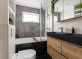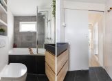 Op de eerste verdieping vind je twee ruime slaapkamers, waarvan de kamer aan de voorzijde is voorzien van een balkon. De badkamer is licht betegeld en uitgerust met een ligbad, dubbele wastafel met meubel, toilet en elektrische vloerverwarming.