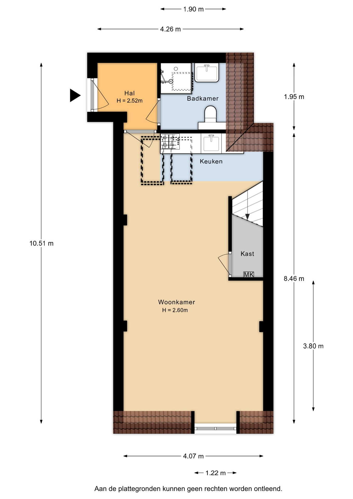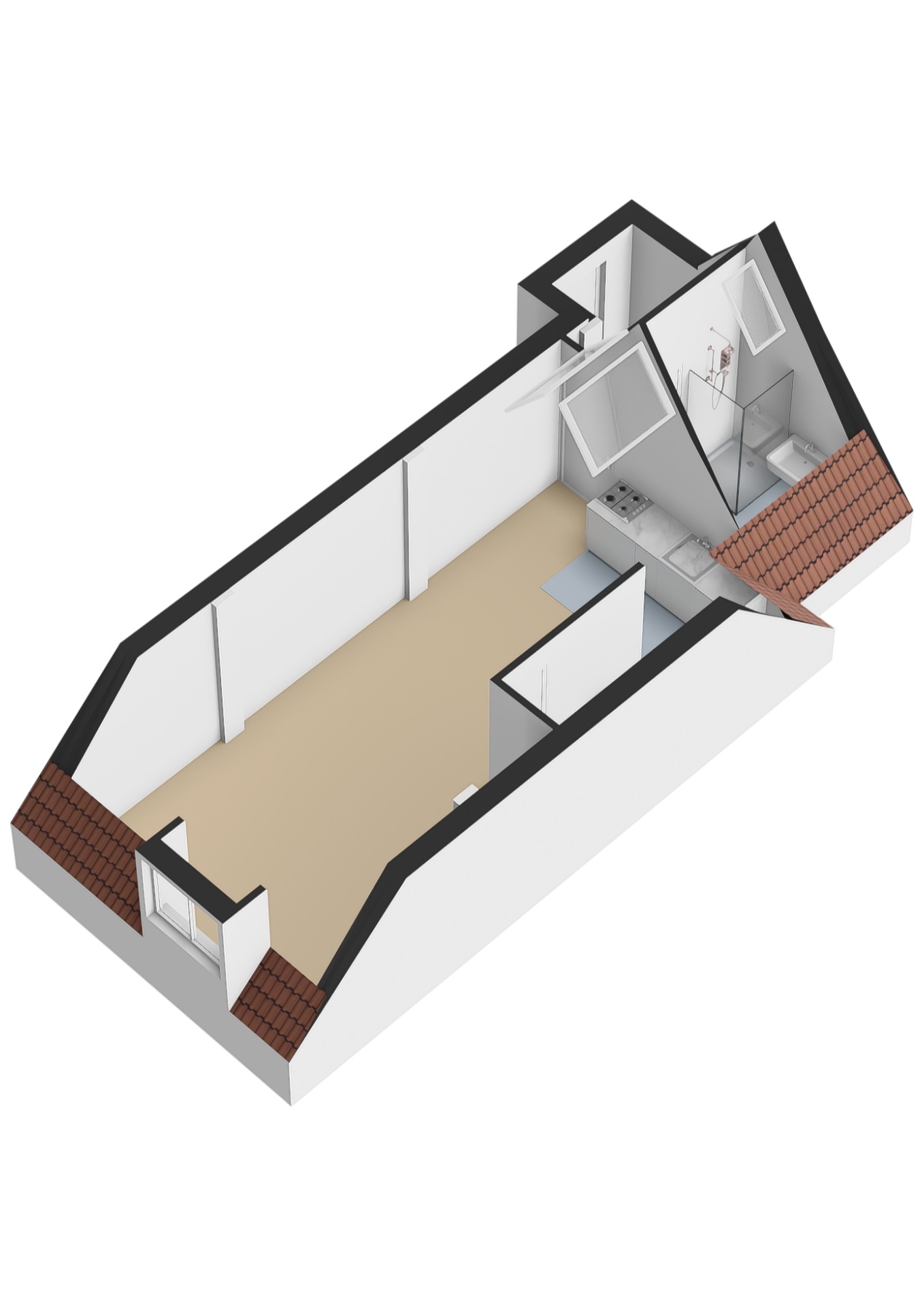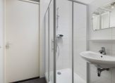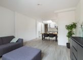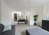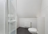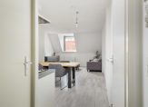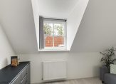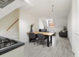 De woonkamer met open keuken is licht en strak afgewerkt. Dankzij de dakkapel aan de voorzijde valt er veel daglicht binnen en ontstaat er een prettige, open leefruimte. De keuken is praktisch ingericht en voorzien van een gaskookplaat, afzuigkap, vaatwasser, koelkast en voldoende kastruimte. Aangrenzend is er ruimte voor een eettafel, zodat koken en gezellig tafelen hier naadloos samengaan.
