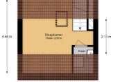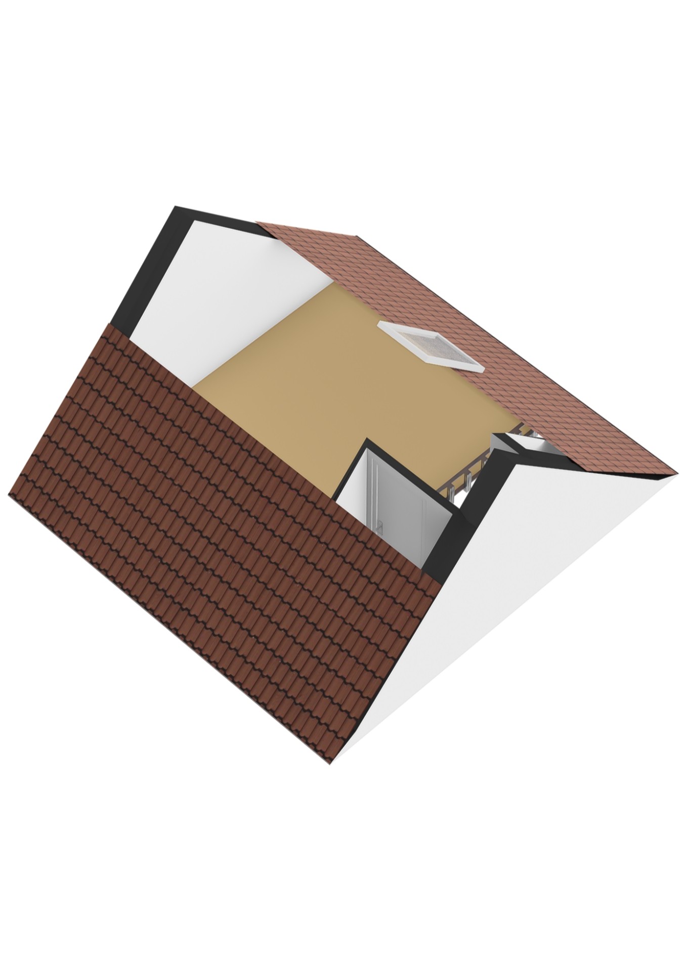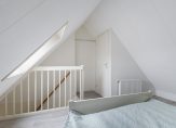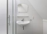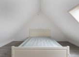 De woning beschikt over een royale slaapkamer op de bovenste verdieping, gelegen onder de kapconstructie. De lichte badkamer is voorzien van een douche, wastafel en toilet.