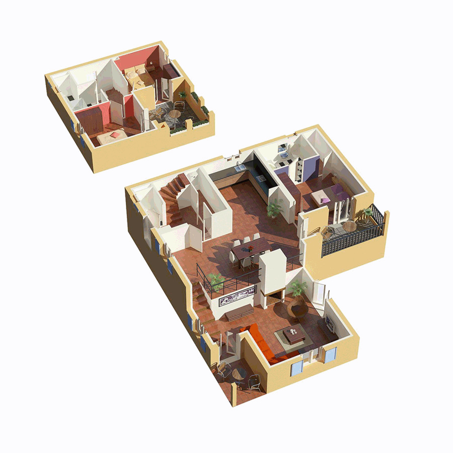* Volledig ingerichte woningen met stoffering en meubilair;