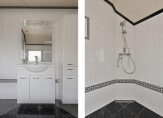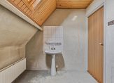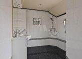 Nette en volledig betegelde badkamer met wastafelmeubel, radiator en inloopdouche. We nemen de trap naar de eerste verdieping, hier vinden we via de overloop drie goede slaapkamers.
