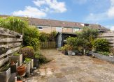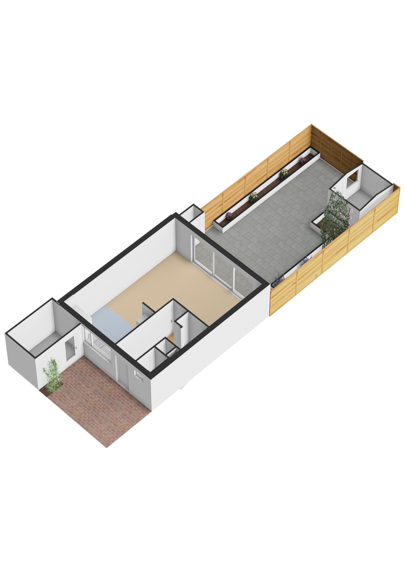 Aan de achterzijde bevindt zich de gezellige zitkamer met een schuifpui naar de tuin, wat zorgt voor een fijne verbinding tussen binnen en buiten.