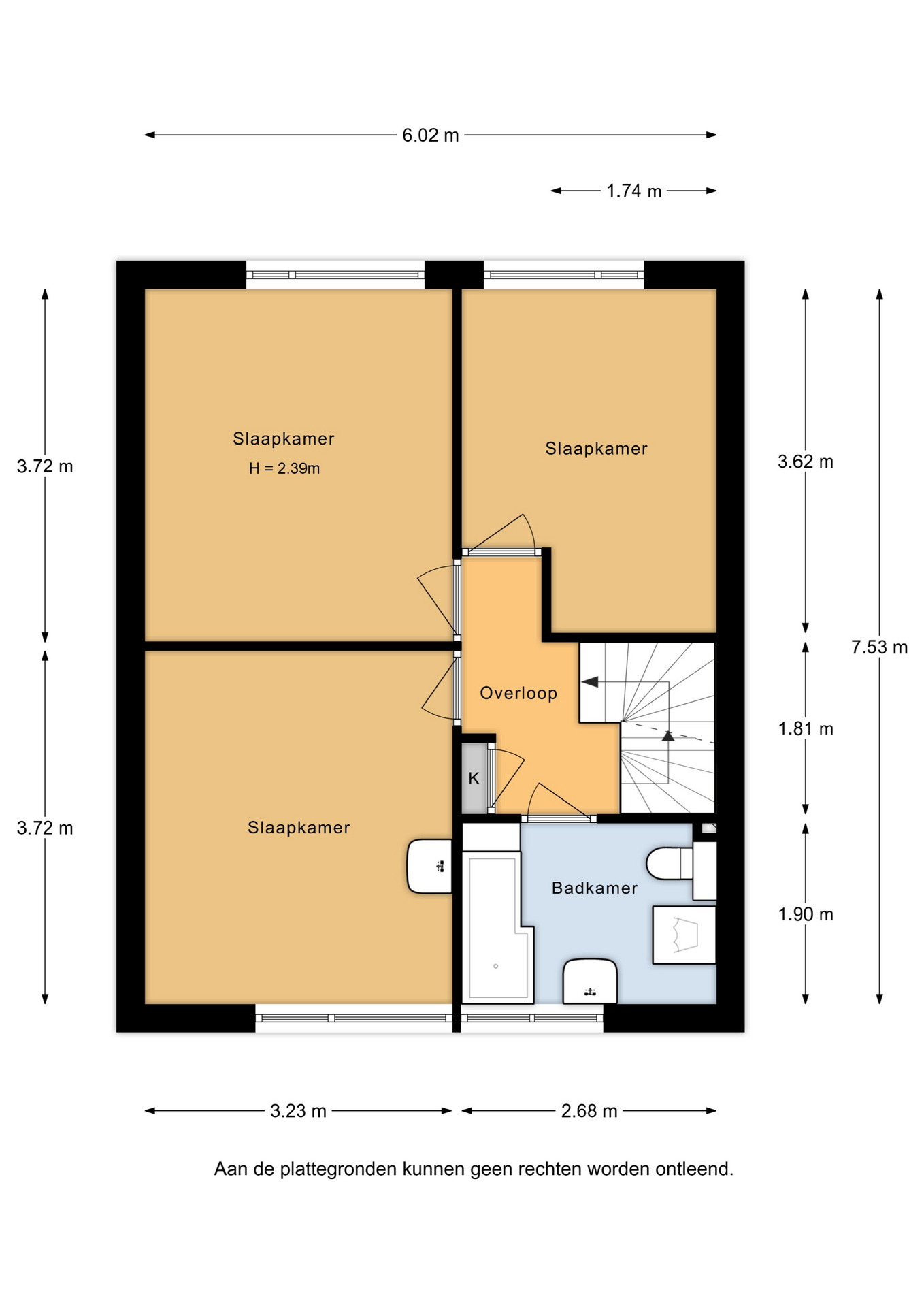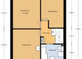 Op de eerste verdieping bevinden zich drie slaapkamers en de badkamer. De hoofdslaapkamer is gelegen aan de tuinkant met nog een andere iets kleinere kamer. De slaapkamer aan de straatkant heeft een wastafel. De badkamer is wit betegeld en beschikt over een douche, ligbad, toilet en een wastafel. Ook heeft de badkamer een wasmachine aansluiting.