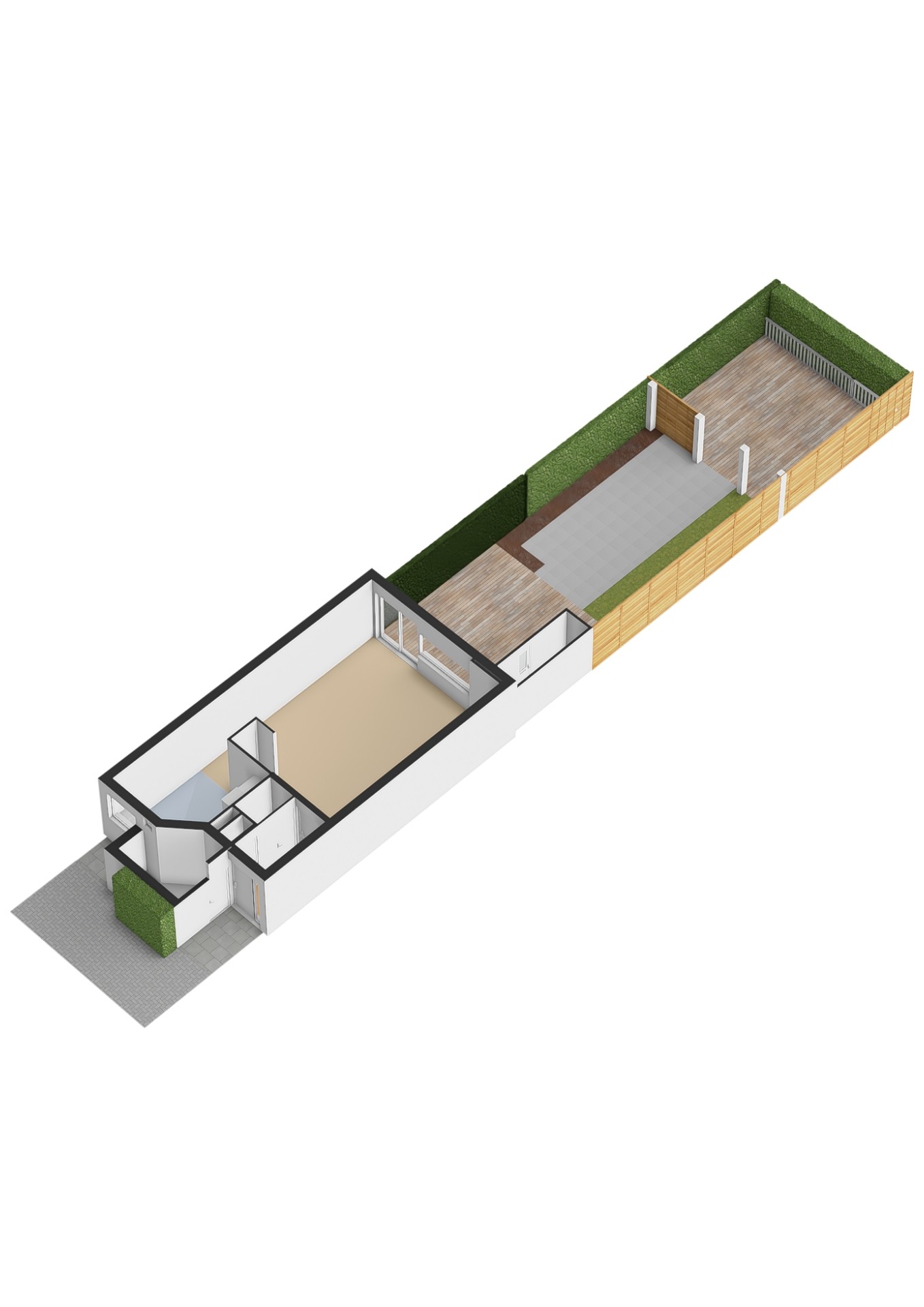 De verrassend ruime woonkamer van ca. 35 m² is heerlijk licht dankzij de brede raampartijen. Via de schuifpui loop je zo de tuin in, waar de groene haag zorgt voor volledige privacy.