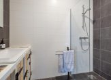 Vanuit de centrale hal toegang tot drie ruime slaapkamers (15, 10 en 10 m2) en een keurige badkamer met wastafelmeubel en een inloopdouche.