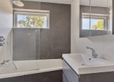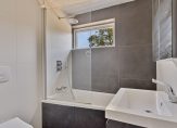 De badkamer heeft een ligbad, douche, een wastafelmeubel en een toilet.