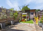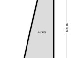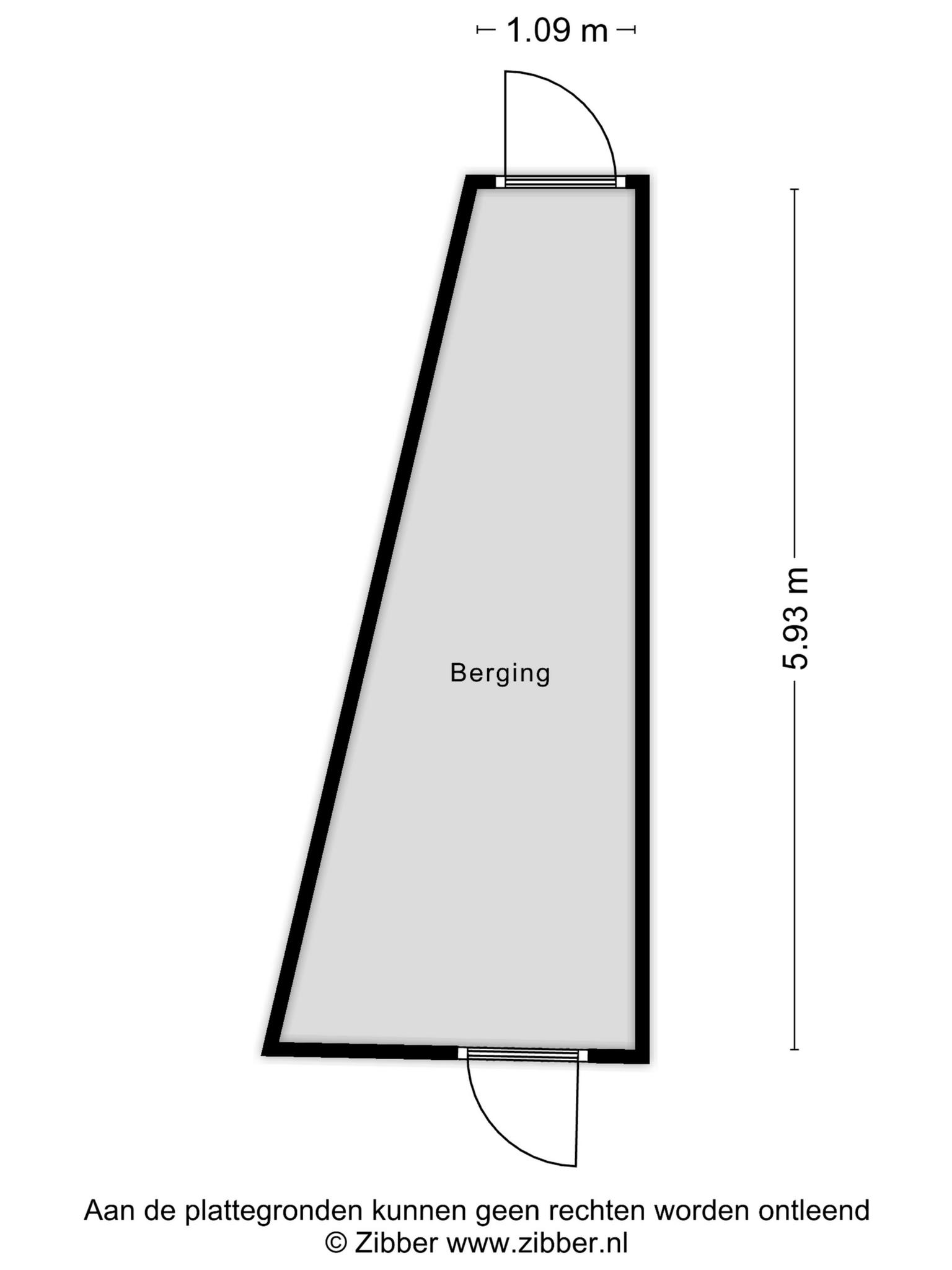 Achterin de tuin is een houten berging, met deur naar buiten.