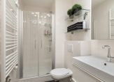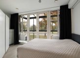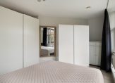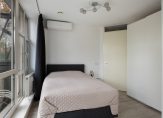 De slaapkamer is royaal van formaat (ca. 14 m²) en biedt ruimte voor een tweepersoonsbed en een grote kledingkast. Ook hier zorgen openslaande deuren voor een directe verbinding met het balkon. De badkamer is modern uitgevoerd met een hangend toilet, douchecabine, wastafelmeubel en handdoekenradiator. Het wastafelmeubel is in 2021 vernieuwd.