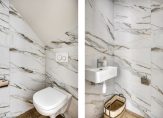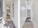 U komt binnen via uw eigen voordeur in een strak afgewerkte entreehal met maatwerk kastruimte en meterkast. Vanuit de hal bereikt u de woonkamer en het luxe afgewerkte gastentoilet met fonteintje (marmerlook tegels).