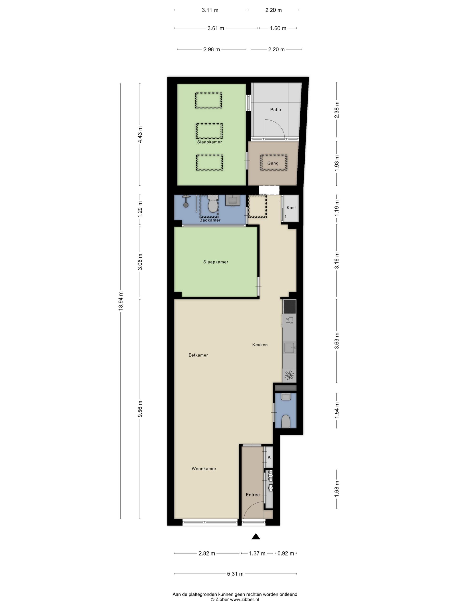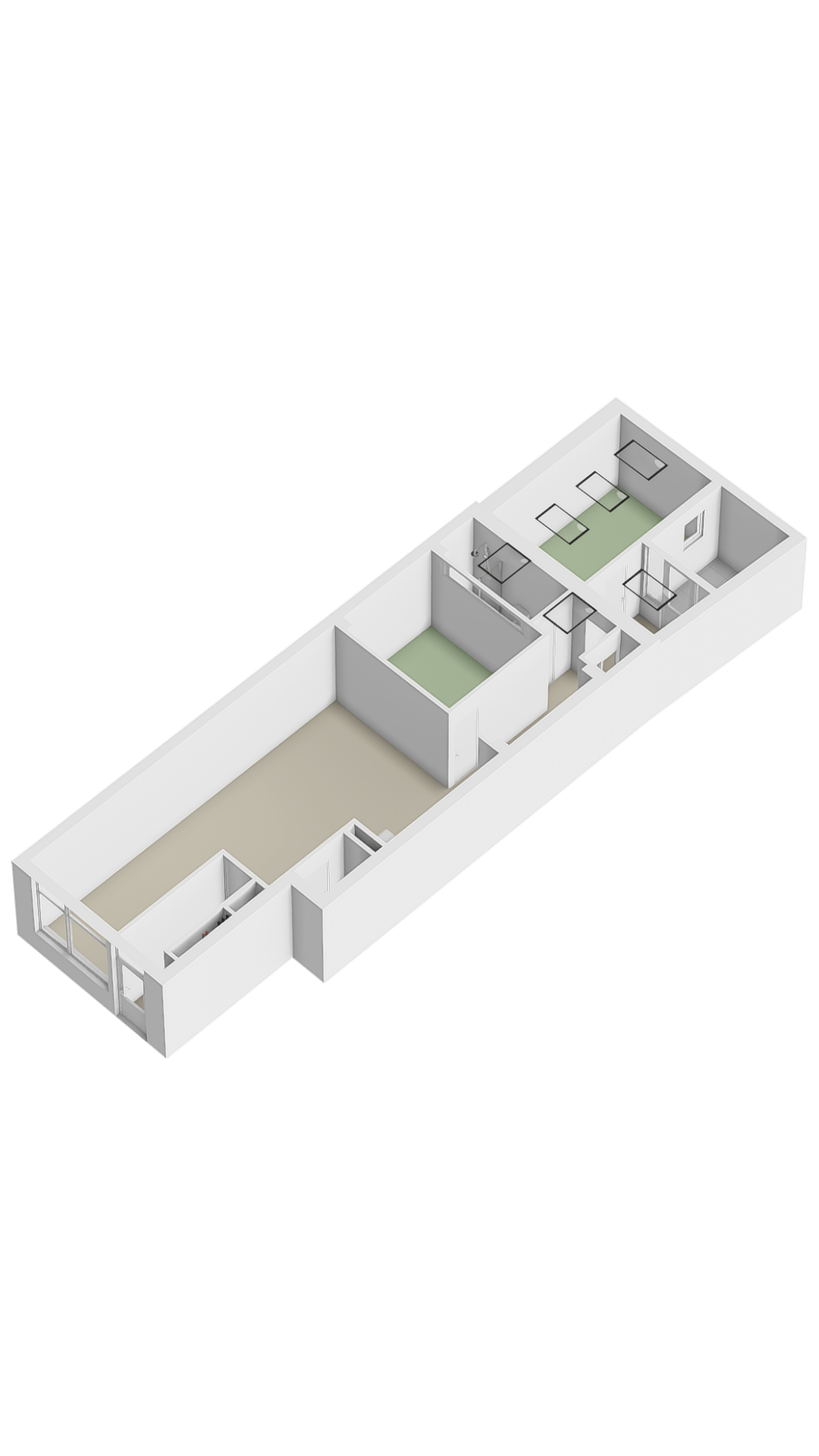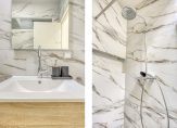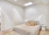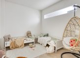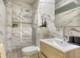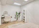 Aan de achterzijde ligt een gang met lichtkoepel, die toegang geeft tot twee slaapkamers, de badkamer, een diepe kastruimte en de patio. De grootste slaapkamer beschikt over drie lichtkoepels en voelt daardoor bijzonder ruim en licht aan. De tweede kamer is ideaal als kinder-, werk- of logeerkamer. De badkamer ligt centraal en is voorzien van een inloop regendouche, modern wastafelmeubel, wandcloset en luxe afwerking in dezelfde marmerlook stijl als het toilet.