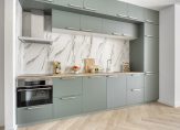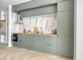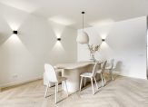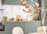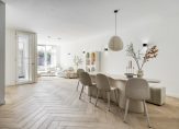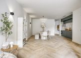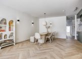 De woonkamer is prettig ruim en dankzij de brede raampartij aan de voorzijde heerlijk licht. De visgraat keramische tegelvloer, lichte wanden en subtiele verlichting zorgen voor een rustige, moderne sfeer. Aan de voorzijde is volop ruimte voor een grote zithoek. Aansluitend vindt u de eetruimte tegenover de moderne keuken, uitgevoerd in een stijlvolle groene tint met marmerlook achterwand, houten werkblad en volledig geïntegreerde apparatuur: inductiekookplaat, afzuigkap, combi-oven, vaatwasser en koel-vriescombinatie.