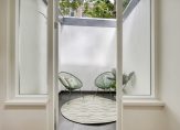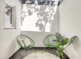 De centrale patio is een echte verrassing. Dankzij de hoge wanden biedt deze plek veel privacy en voelt het als een rustige buitenkamer. Een heerlijke plek voor een kop koffie, een borrel of om op warme avonden lekker te ontspannen.