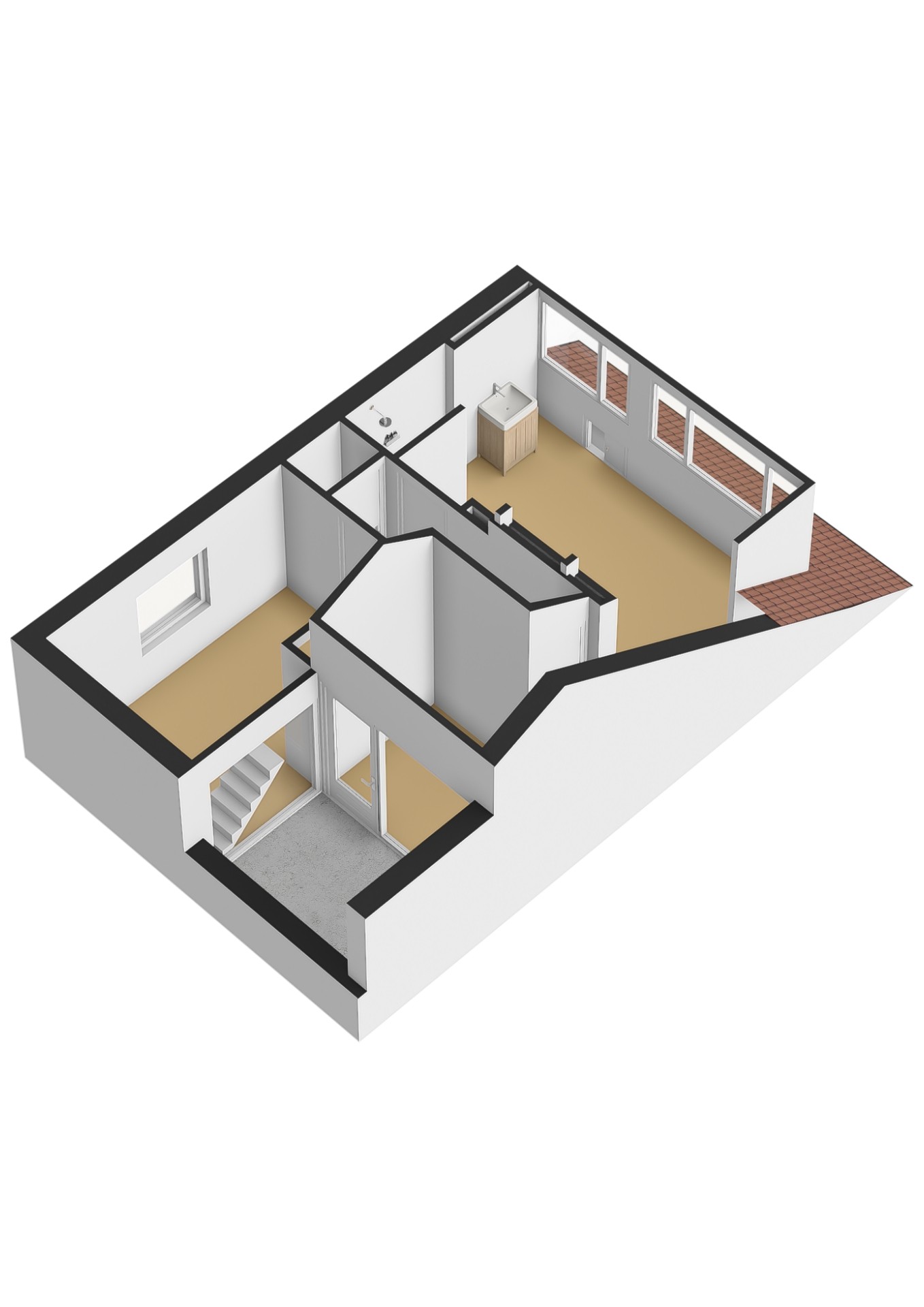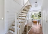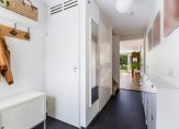 From the spacious driveway and sunny front garden, you enter this comfortable home. The hallway leads to a coat rack area, modern toilet, utility cupboard, stairs to the first floor, and the living room.