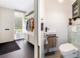 The front garden faces south; the rear garden faces north. This means you enjoy sunshine in the garden without overheating the home, as the sun doesn’t shine directly on the rear glass façade. Thanks to the front, side, and back gardens, the veranda, and the second-floor loggia, you can always choose sun or shade.